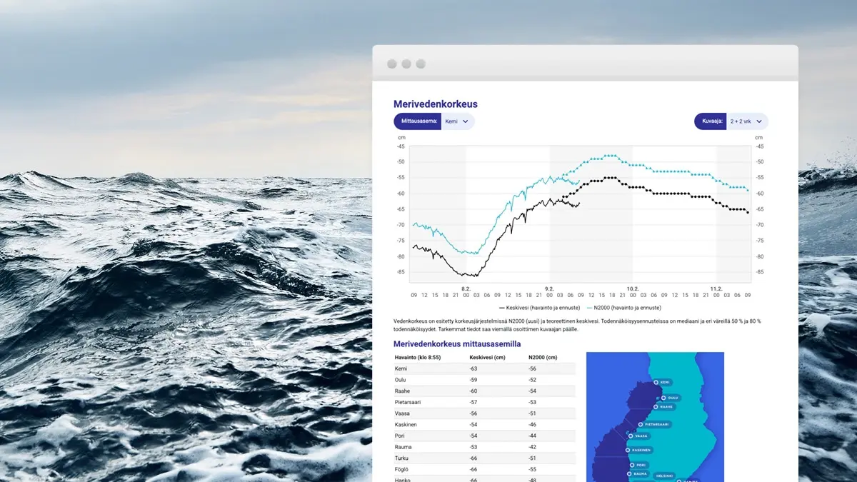 Här kan du granska vattenståndet längs finska kusten just nu och havsvattenståndets prognoser, i båda höjdsystemen.