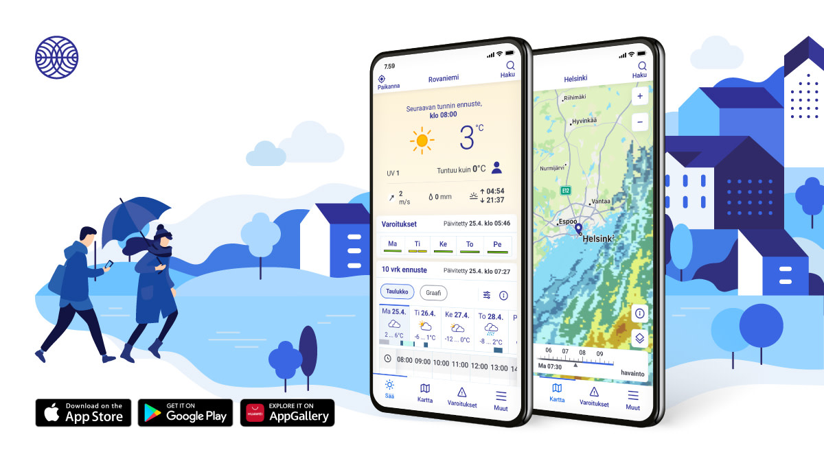 Vid sidan av de bekanta elementen i väderapplikationen har en ny kartdel lagts till i applikationen samt möjlighet att välja de väderuppgifter som är viktiga just för dig. I kartans animationer kan du följa med bland annat regnområdenas rörelse. En regnprognos baserad på radarbilder visar vart regnen rör sig under de kommande timmarna. Nytt är också möjligheten att se väderprognoser och väderobservationer enligt eget val antingen som graf eller i tabellform. I vår väderapplikation får du väderinformation för nästan alla orter i Finland. Genom att tillåta lokalisering av din telefon visar tjänsten automatiskt väderprognosen för din position fram till 10 dygn. I applikationen kan du också spara din favoritort i Finland och utomlands. Applikationens visuella utseende har förnyats och den nya genomförandetekniken gör det möjligt att smidigt använda applikationen på olika terminaler. Även de digitala tjänsternas tillgänglighet har också beaktats bättre än tidigare. Applikationen är fortfarande avgiftsfri och innehåller inte reklam. Vi fortsätter att utveckla väderapplikationen och till näst publicerar vi bland annat nya widgets.
