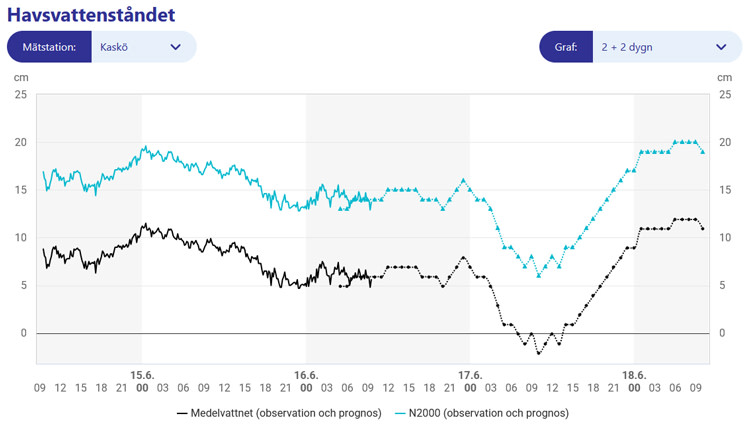 Den som har ett nytt N2000-sjökort ska titta på N2000-kurvan i vattenståndsprognosen, men den som har ett äldre sjökort där vattenståndet observeras i förhållandet till det teoretiska medelvattenståndet ska titta på kurvan för teoretiskt medelvatten.