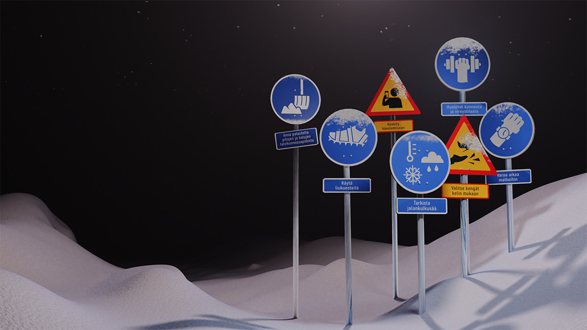 Trafikmärkena som skapats för Håll dig på benen-kampanjen grundar sig på sju viktiga steg som under årens lopp har lyfts fram i kampanjen. Med trafikmärkena vill man uppmärksamma människorna om att de genom sitt eget agerande kan minska halkrisken. Håll dig på benen-kampanjen är i gång 13-24.1.2021. På sociala medier kan du följa diskussionen med hashtaggen #pysypystyssä. På webbsidorna www.pysypystyssä.fi publiceras artiklar som behandlar halkolyckor och olika sätt att förhindra dem.
